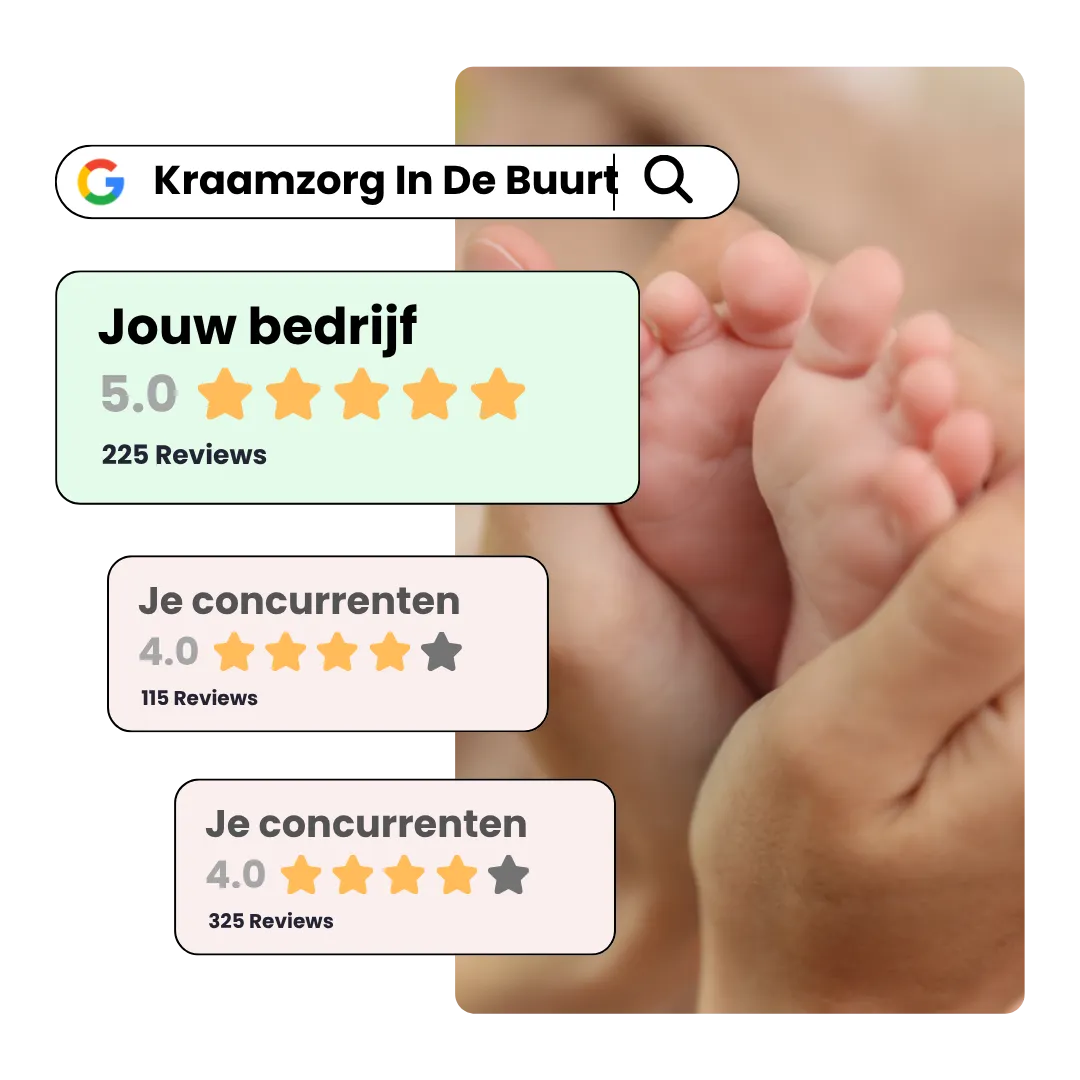 Terwijl jij je bedrijf runt, regelen wij je reviews van A tot Z. Aanvragen, beantwoorden en slim inzetten — zodat jij hoger scoort in Google en nieuwe klanten je vanzelf vinden.