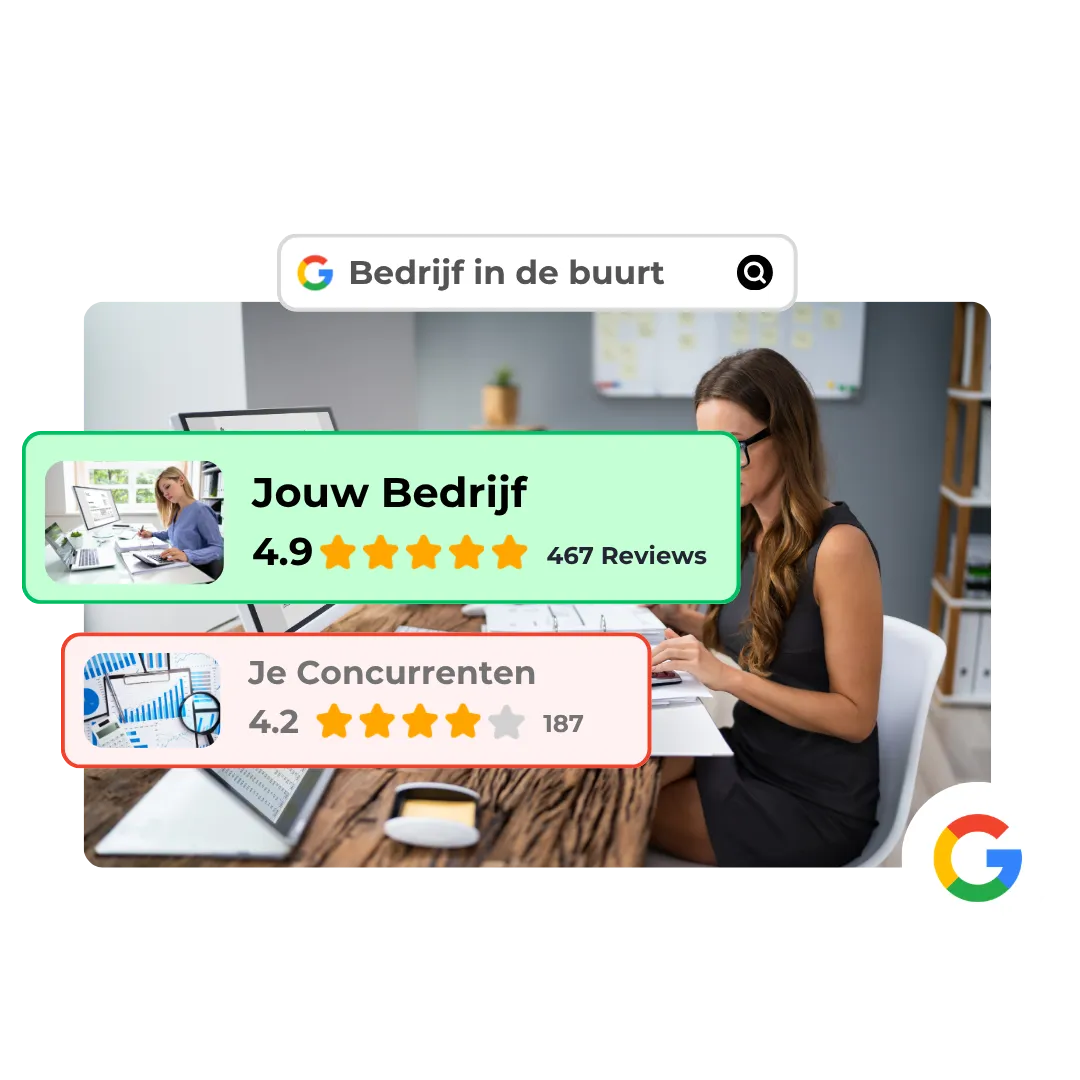 Een sterke online reputatie is geen luxe — het is een noodzaak. Met onze geautomatiseerde Google-reviewoplossing verzamel je meer reviews, win je het vertrouwen van nieuwe klanten en blijf je de concurrentie voor..